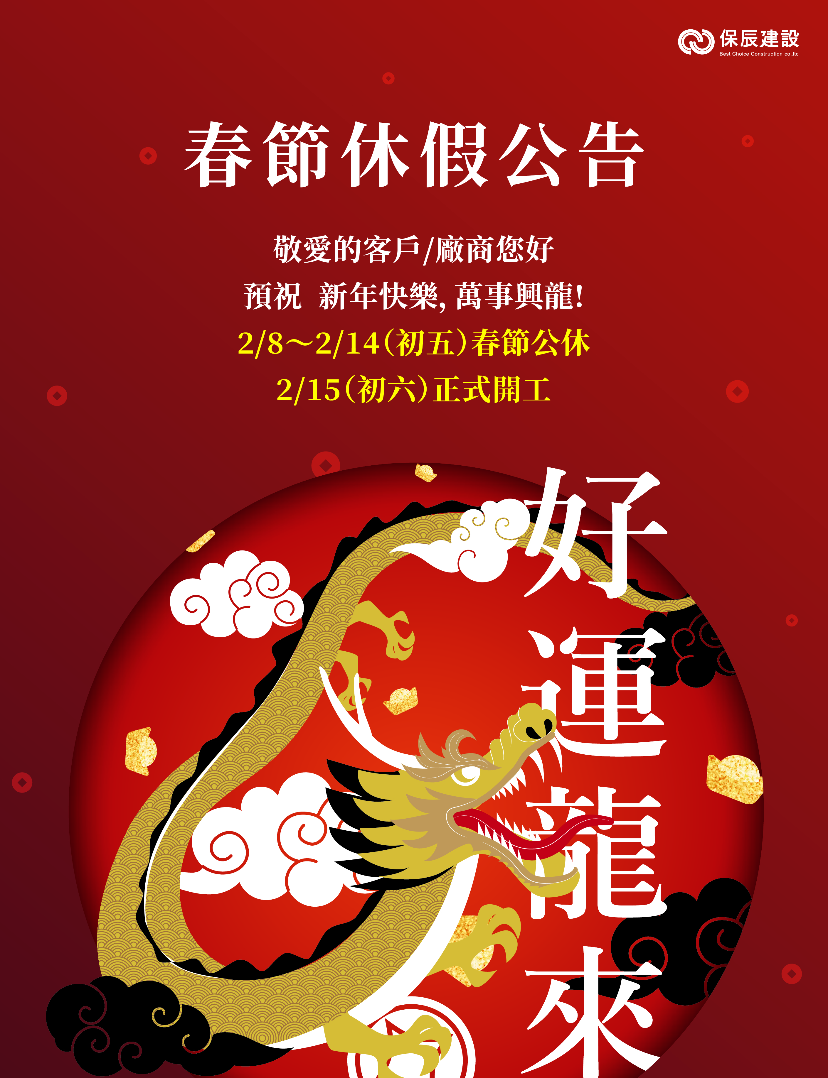 春節休假公告!! 保辰過年休假時間 保辰建設僅訂於過年期間2/8~2/14(初五)春節公休